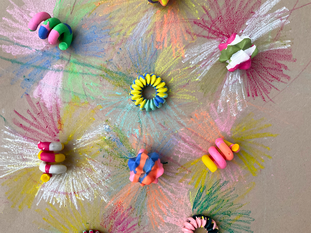 crayons designed far from their traditional form within the sustainability realm . made out of beeswax waste from honey harvesting mixed with powdered food coloring . research project for further commercial application . san roque-ec 2022